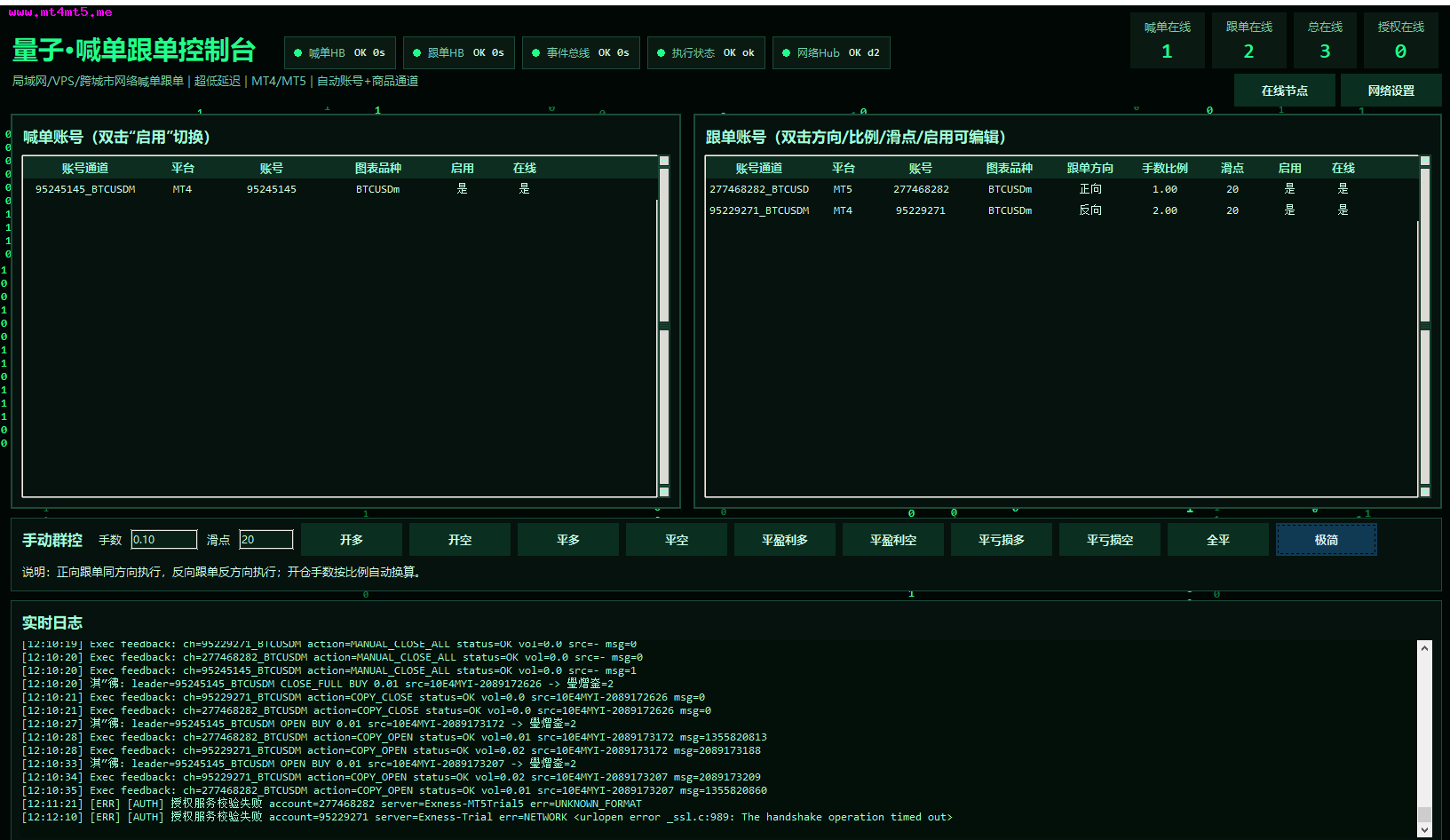 量子·网络喊单跟单系统:让MT4/MT5无论是本地电脑、局域网、VPS还是跨城市电脑终端都可以一键互联自由喊单跟单,控制端统一管理群控不同电脑的MT4/MT5,专业级网络交易中枢,交易指令毫秒级下发,状态全程可视化。零配置上手:主控与 Agent 自动连接。双栈架构:云中继 + 局域网同时可用,稳定性与灵活性兼得。智能发现:同局域网自动发现,跨网络云端直连。通道智能匹配:账号 + 品种自动路由,减少错单与混线。分组隔离安全:Token 机制隔离不同用户,互不干扰。实时可视化:在线节点、授权账户、执行反馈一屏掌握。量子·网络喊单跟单系统把“跟单工具”升级为“可规模化运营的网络交易基础设施”。立即部署量子·网络喊单跟单,开启你的专业化网络跟单系统。(系统仅提供技术连接与指令转发,不构成投资建议。)下载:
